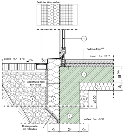 Im Sockelbereich an Außenluft (z.B. Tiefgarage), außenseitig gedämmt, Tragschicht durchlaufend, Erdreich auf Deckenniveau, Fenster/Tür in der Wandebene, Var. 1