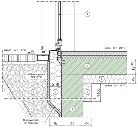 Im Sockelbereich an Außenluft (z.B. Tiefgarage), außenseitig gedämmt, Tragschicht durchlaufend, Erdreich auf Deckenniveau, Fenster/Tür in der Dämmebene, Var. 1