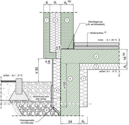 Im Sockelbereich an Außenluft (z.B. Tiefgarage), außenseitig gedämmt, Tragschicht durchlaufend, Erdreich unter Deckenniveau