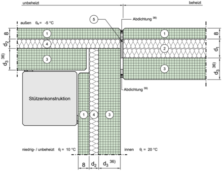 Ohne Versatz, Trennwand zwischen unterschiedlichen Nutzeinheiten, zu unbeheiztem Raum, Tragsystem bestehend aus Deckenscheibe und Tragschale und/oder Stütze vor Tragschicht