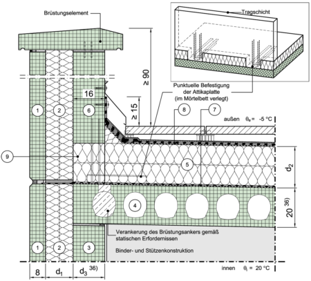 Hohlplattendecke mit Dämmung und Abdichtung, thermisch getrenntes Betonelement als Attika, begehbares Dach
