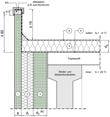 Tragschicht aus Trapezprofilen mit Dämmung und Foliendeckung, Attika umlaufend gedämmt, Vorsatzschicht als Attika, Ortgang