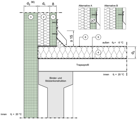 Tragschicht aus Trapezprofilen mit Dämmung und Foliendeckung, Anschluß an aufgehende Wand (Ortgang)